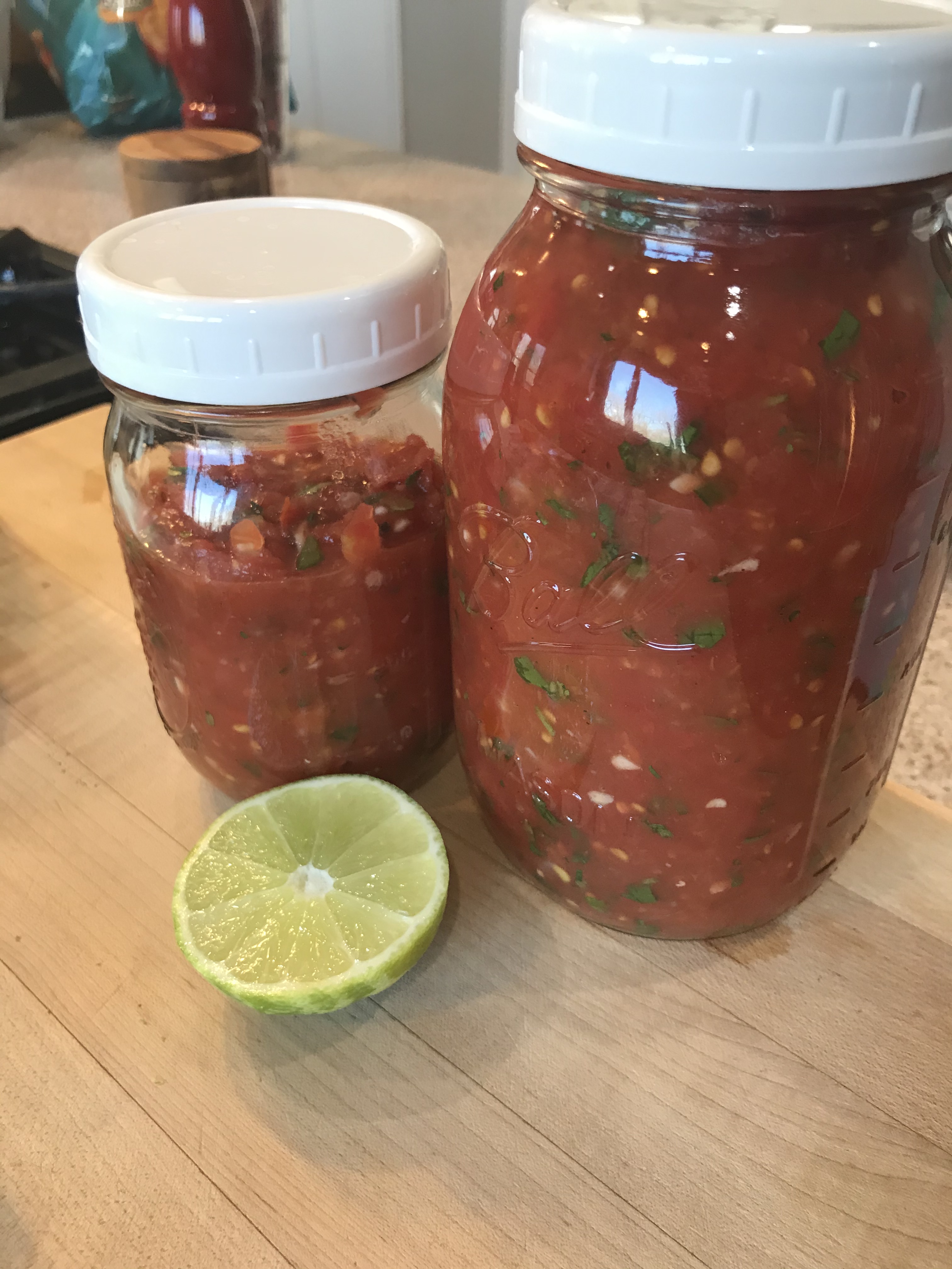 I don’t like my salsa too watery, so I drain all of the tomato products in use in this. I also do not use my home canned tomatoes, because they tend to be more watery since they were very ripe when I canned them. I save the sauce/juice from the whole tomatoes and I throw that in whatever spaghetti or meat sauce I make later, but that’s up to you.