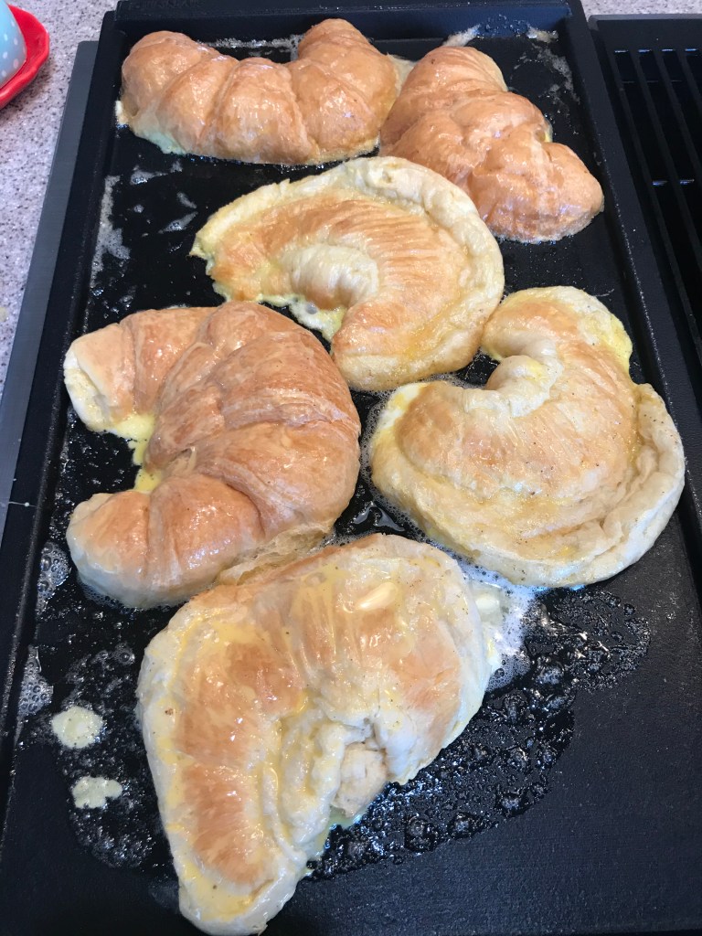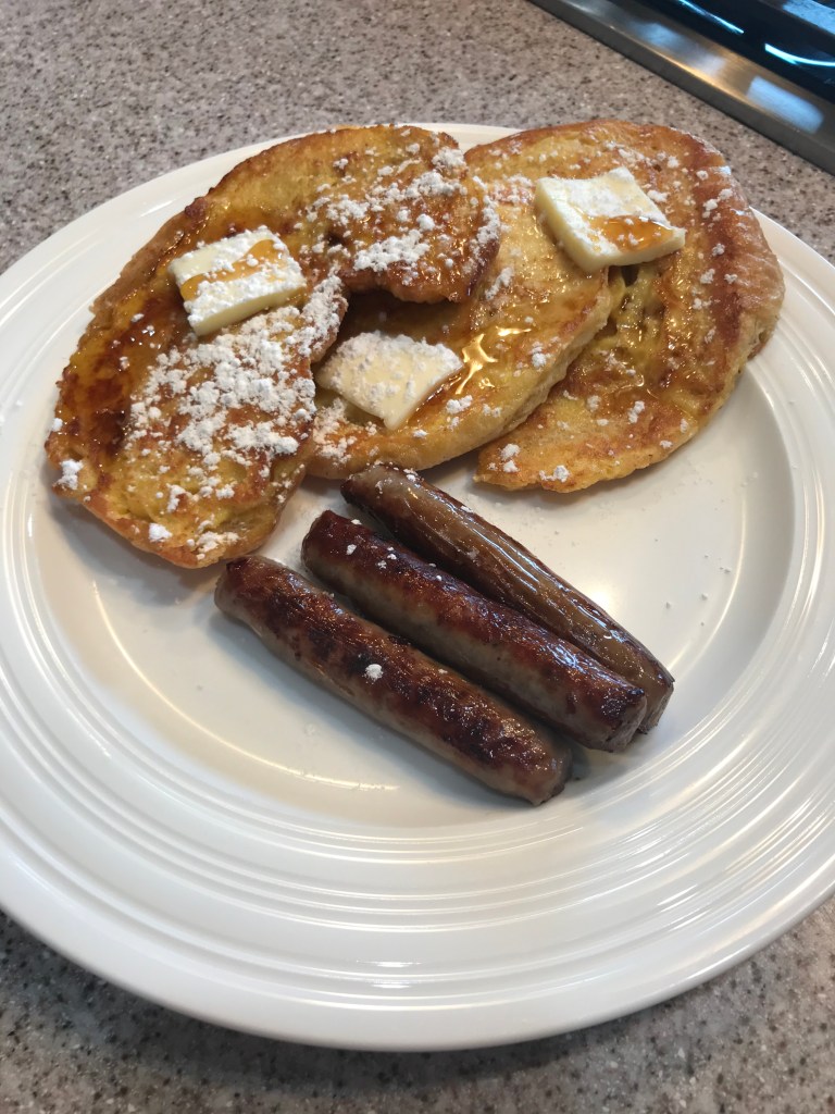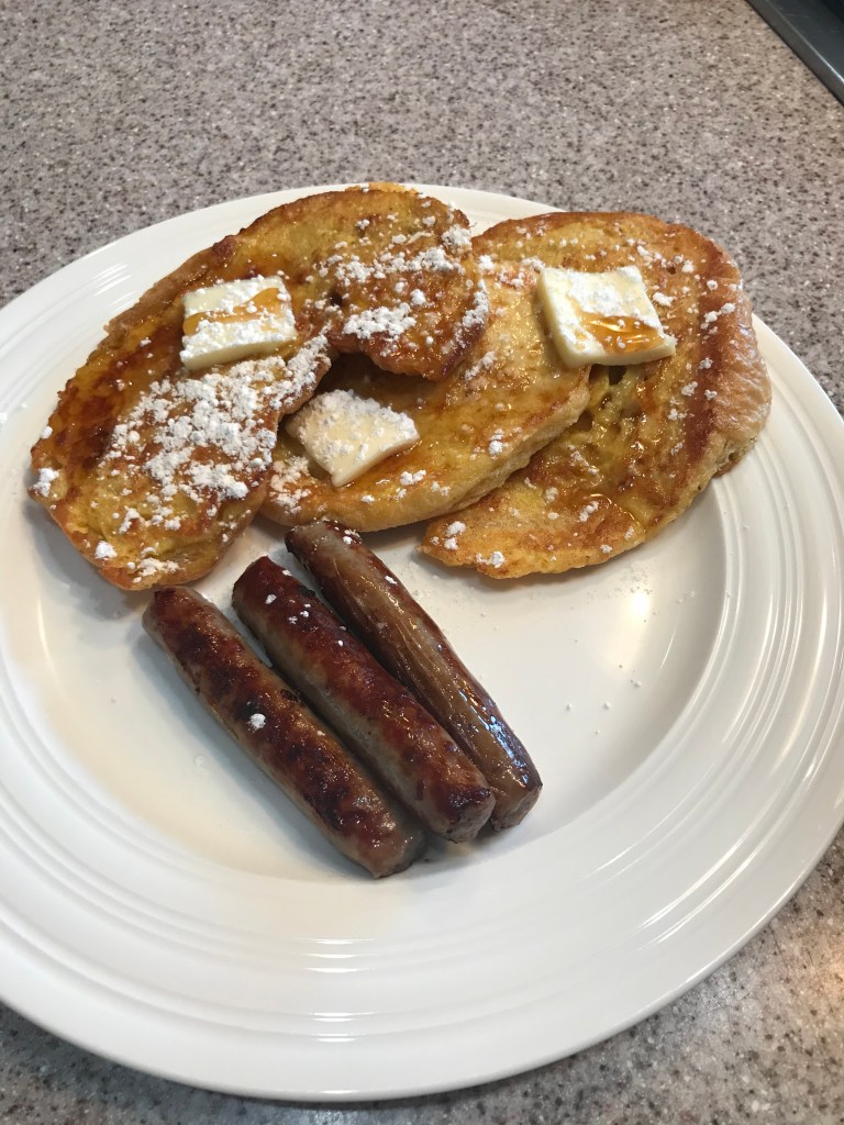 Lay the coated croissant cut side down to start. Add 1-2 more pieces, but don’t crowd the pan so they will brown nicely. All them too cook on that side for 8-10 minutes, or until they turn golden brown. Flip the finished sides over and cook another 5-7 minutes or so until the top side is browned and the egg mix is cooked through. You want them to be a little crunchy and the croissant to be cooked through. If you make this with brioche or thick cut break you will want to adjust your heat a little lower and cook a few more minutes. Quick and easy, right? Add butter, syrup, powdered sugar or jelly and enjoy. Also good with sausage links as seen here. 🙂