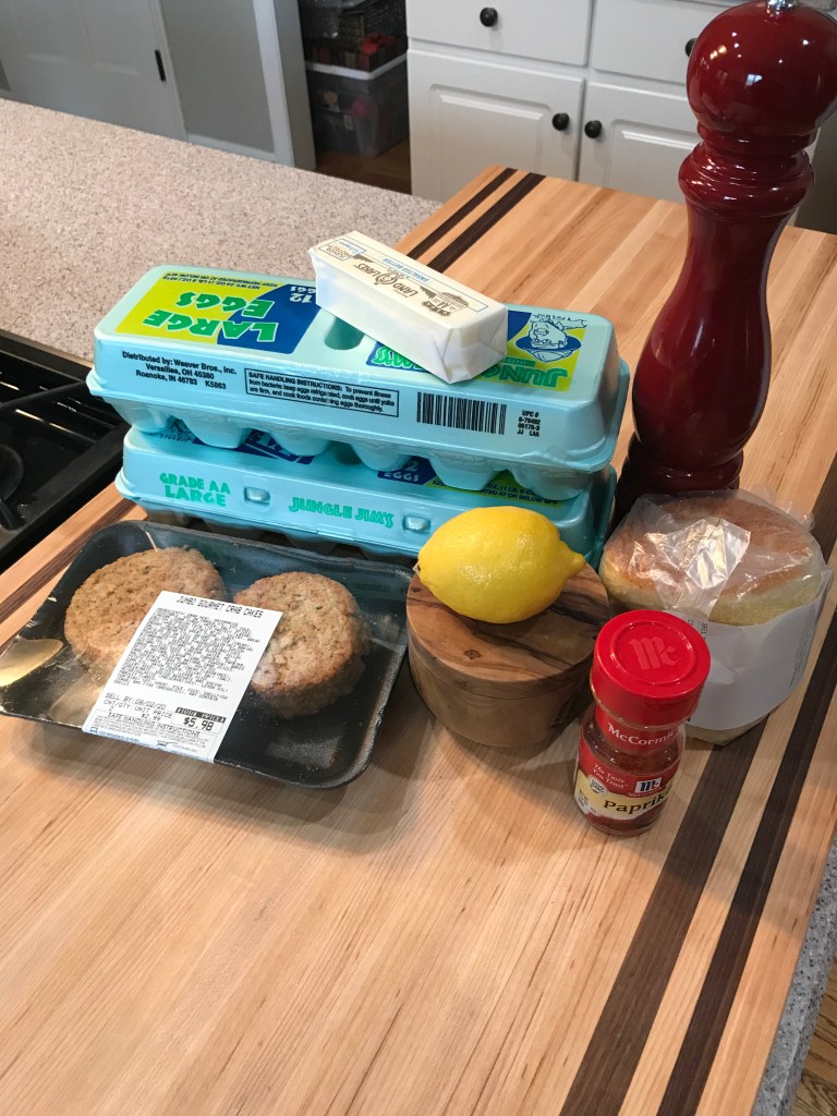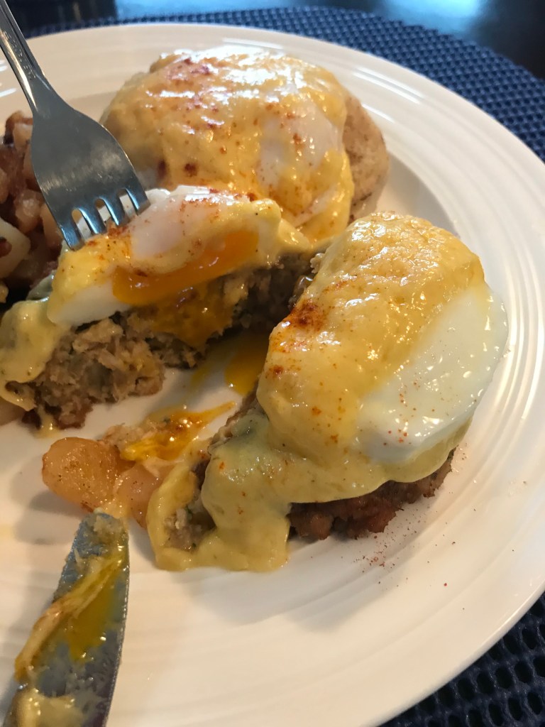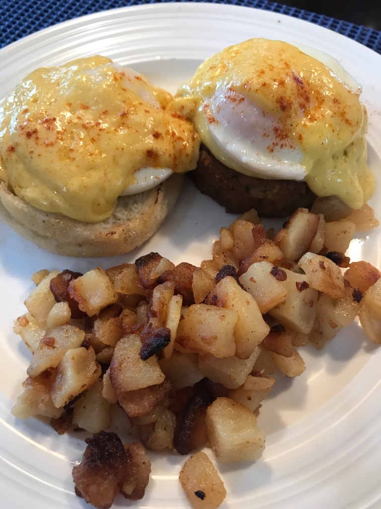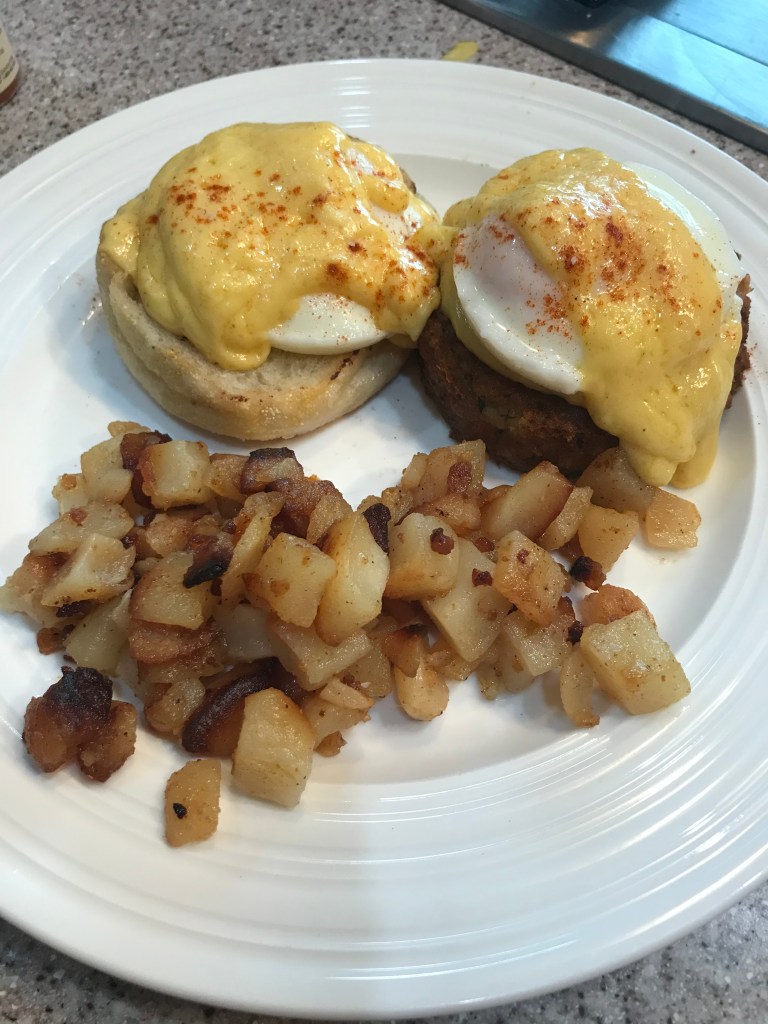 Eggs Benedict is really nothing more than an English muffin topped with some Canadian bacon, a poached egg and creamy hollandaise sauce. This is one of my absolute favorite breakfast foods, and I am being serous this time. I just started eating this as an adult, out at some random brunch one morning. I was totally in love with it at first bite. I’ve had it a lot of different ways….traditional with an English muffin, on a bed of spinach and tomato for a low carb version, and one of my favorites is on a crab cake. The picture above is one traditional and one crab cake. My local international market had crab cakes on sale and they also happened to English Muffins from one of our favorite local bakeries. I couldn’t decide so I made one of each. I was not disappointed.