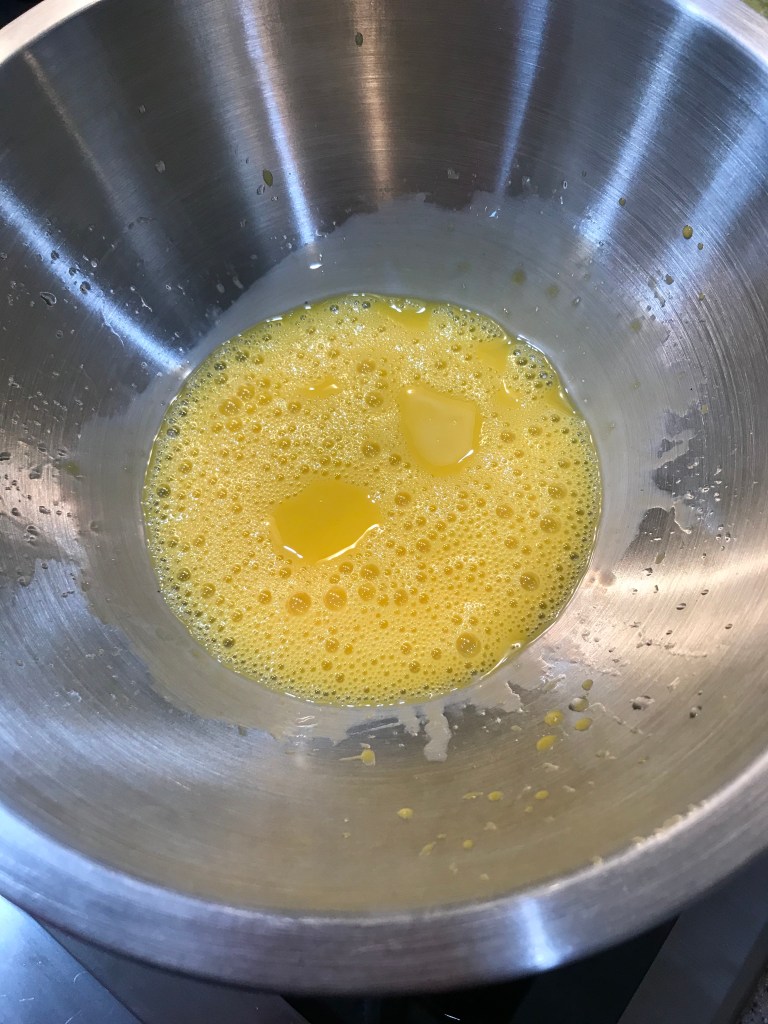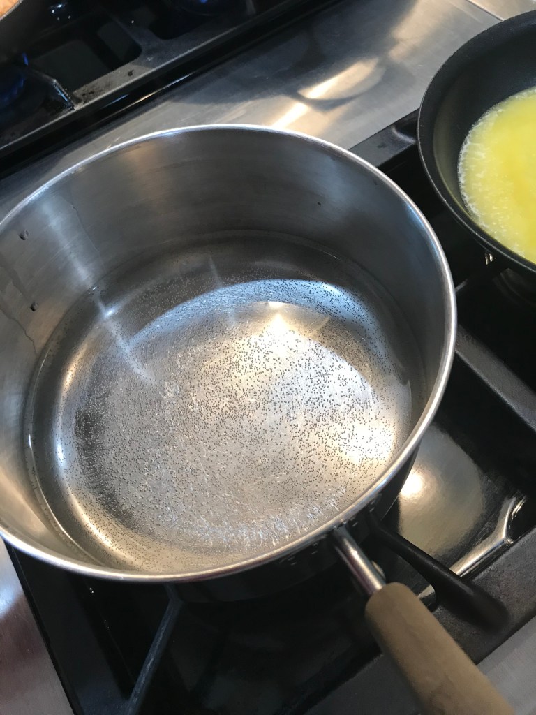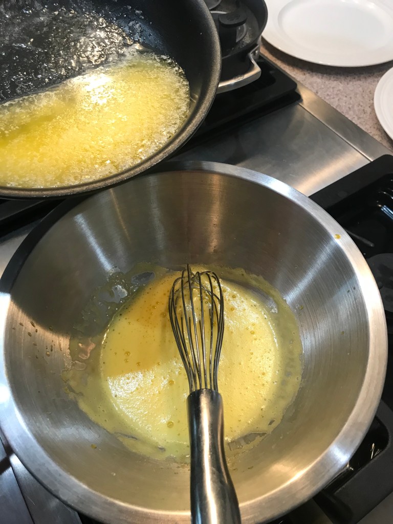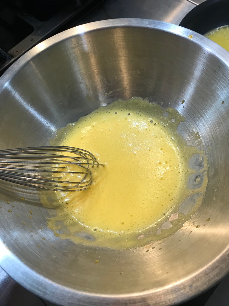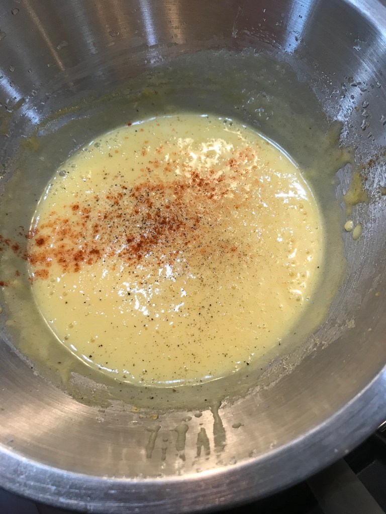 You will also need a double boiler set up for this. That’s just a pan of simmering water with a heat proof bowl over it. The bowl should fit in the top without touching the water. In the bowl, whisk together the egg yolks and the lemon juice. Keep whisking over the simmering water. This is going to take a few minutes of your time and attention but it will be totally worth it. The eggs will start to turn pale and thicken up a little bit. Move the bowl on and off the heat to keep the eggs from totally cooking. The point of all this whisking is to SLOWLY start to cook the eggs. You will finish that off with the warm butter. Now you are ready to VERY slowly drizzle (and I mean a tiny bit at a time, especially at the beginning) the butter into the eggs while continuing to whisk. This will thicken up the sauce and emulsify the butter and the egg together. It takes practice but it’s worth it. Season the sauce with a little salt and paprika. Sometimes I will add some cayenne too, depending on what else I’m going to use the sauce on.