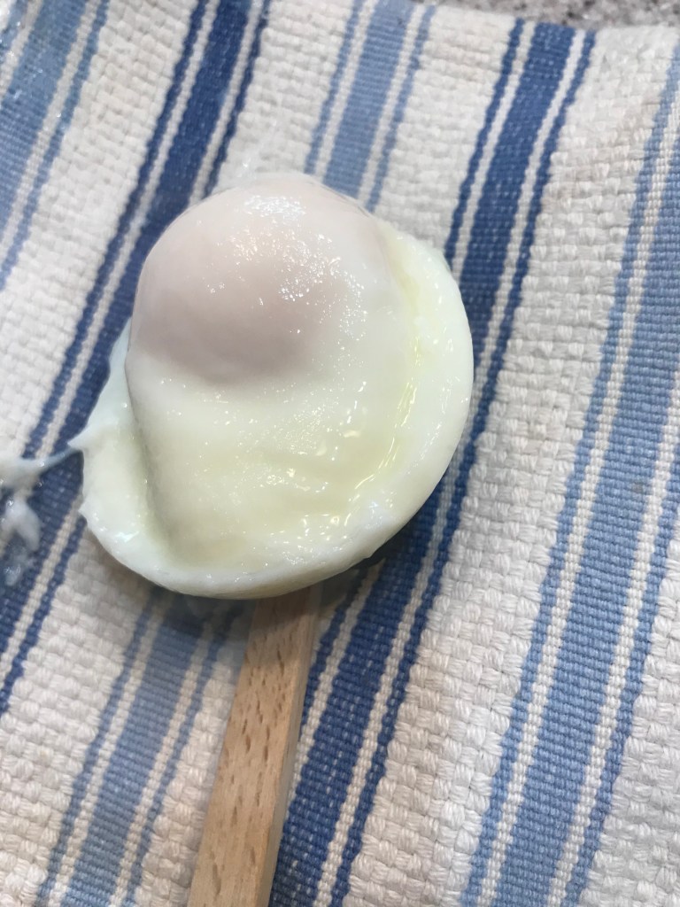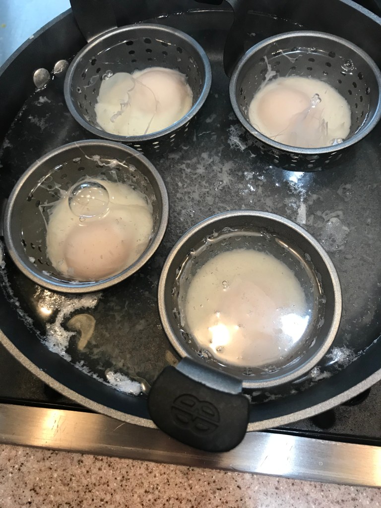 Poached eggs – I have a fancy set of little perforated cups that I make my eggs in (see the pic), but when I’m just making them for me for breakfast, I just use simmering water. Bring water to a simmer in a medium saucepan or deep skillet. Add about 1 -2 tsp of white vinegar to the water. This will help the eggs set up. Crack the eggs in a small cup, then gently drop them in the simmering water. I circulate the water around each egg just to try to keep them together. Let them hang out in the barely simmering water for 3-4 minutes. Take them out and drain them on a clean towel. Stack your toasted English muffin with a piece of the warmed up bacon, then an egg. Note: I like to put some sauce directly on the English muffin, but I am a junkie about this stuff and that might be a bit much for a beginner on this dish. Top the whole thing with some of your fabulous hollandaise sauce. Sprinkle with salt and pepper, and add some paprika to make if fancy if you are in the mood.