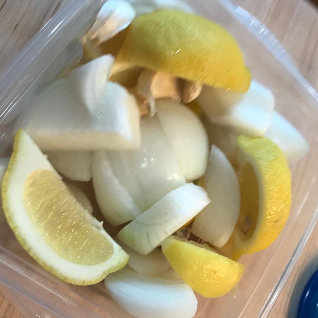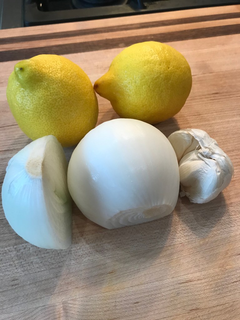 Mix the spices together and quarter/slice the lemons and onions. You can do all this ahead of time and keep the spices covered and the rest stashed in the fridge until you are ready.