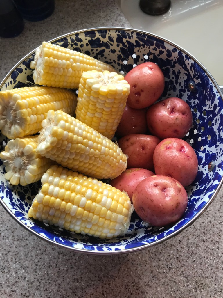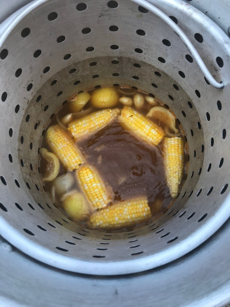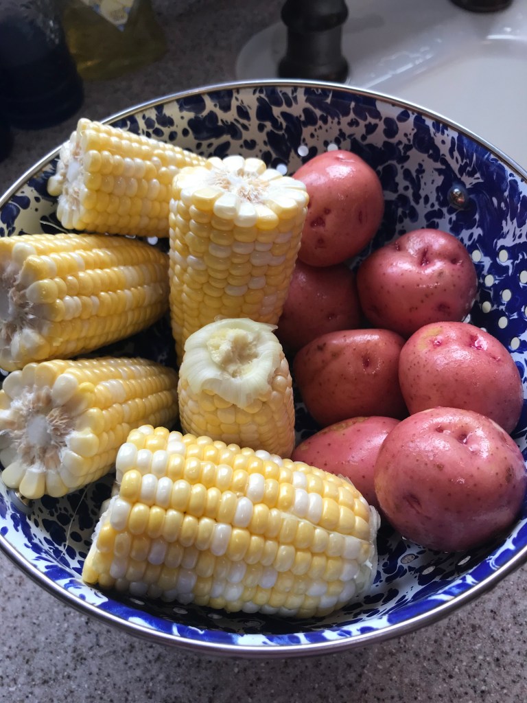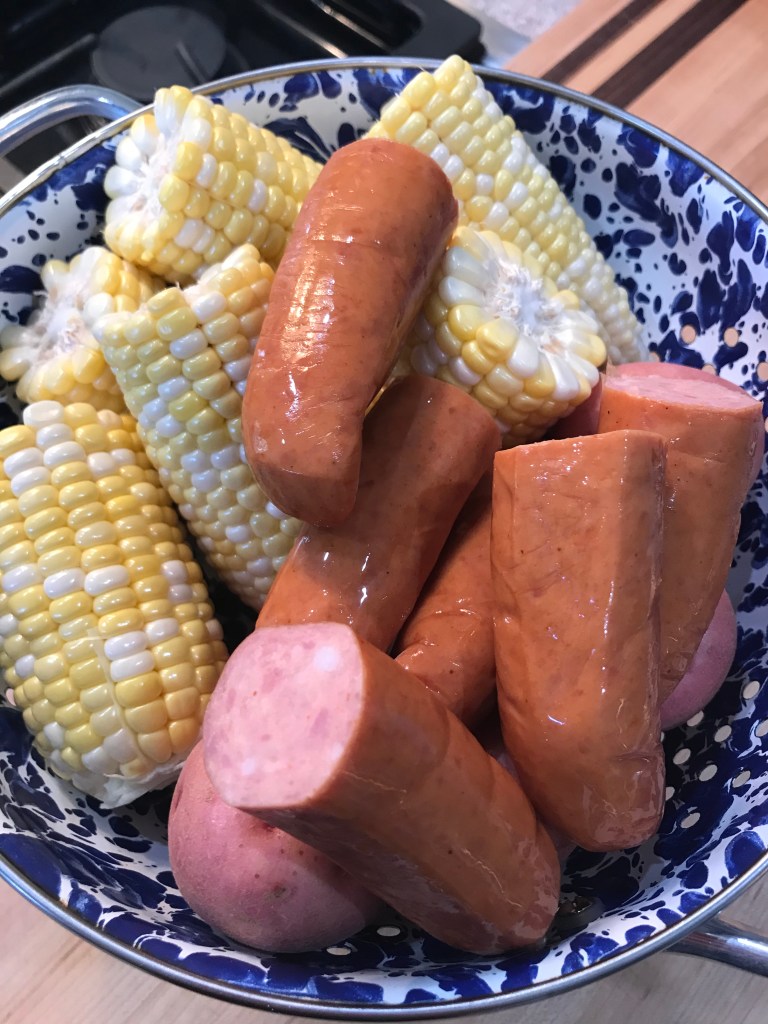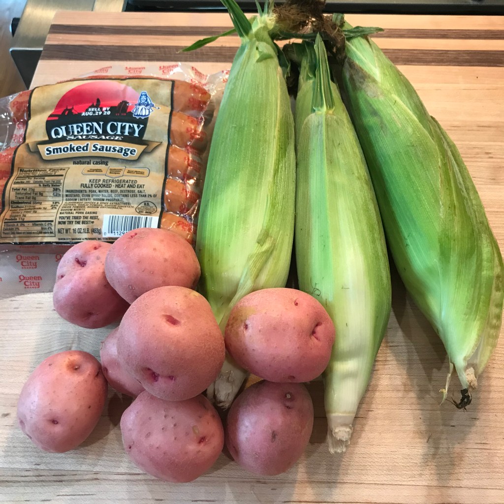 Traditionally a boil contains a sausage, corn and some sort of potato. I use a local sausage that I like (smoked) and sweet corn that I shuck and break in half. Wash the potatoes and you are ready to go.