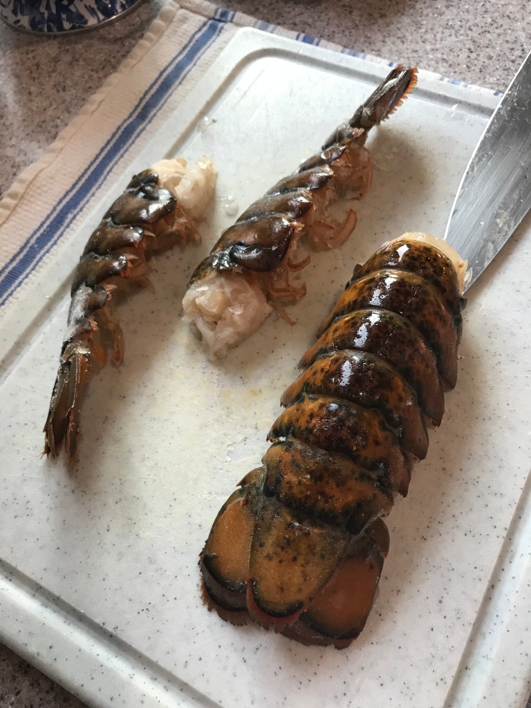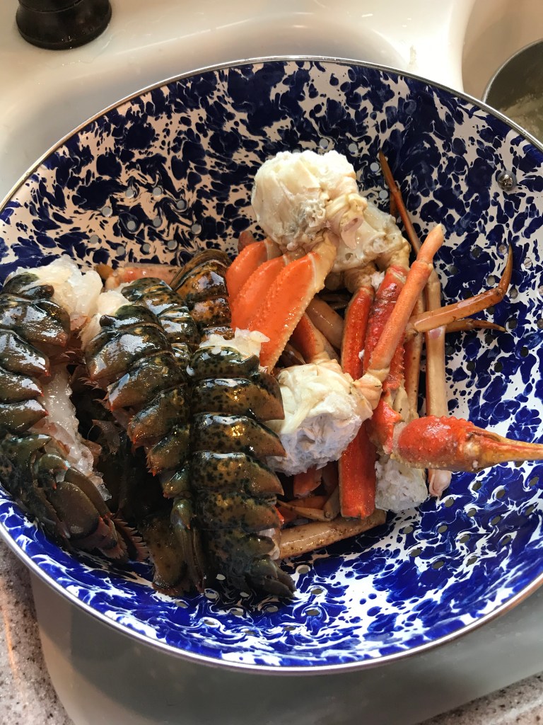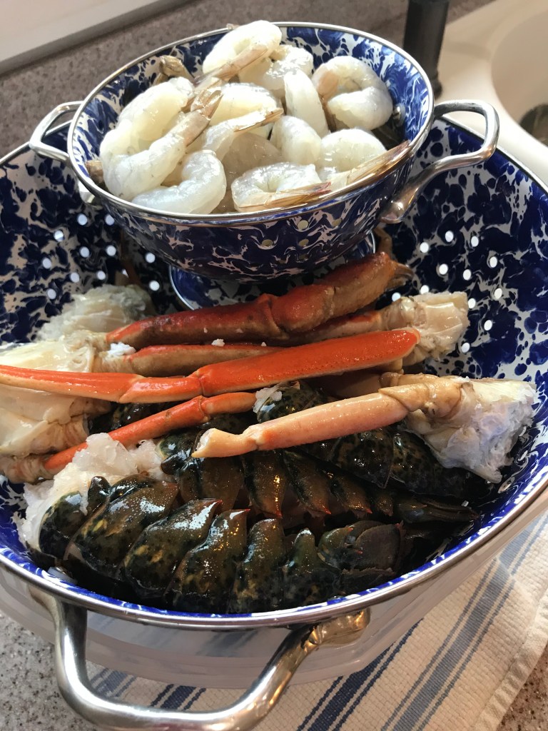 I tend to like smaller shrimp for a boil (the size would be like 21-30 per lb.). They seem to taste better to me. I also like to find deveined, easy peel shrimp that you can usually find frozen – yes frozen are fine for this but I defrost them in the fridge before hand. I live in the middle of the country so my choices are limited and good quality frozen shrimp are great. I really prefer my shrimp deveined, but you can use whatever shell status or size shrimp you prefer. It’s your food after all. 🙂 I do cut the lobster tails in half just to make them easier to pull out of the shell after they are cooked. Nothing else to do to them or the crab legs. I just make sure they are mostly defrosted and rinsed off.