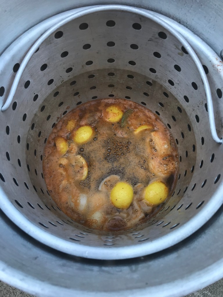 Start the boil with about 3 quarts of water and the beer over medium high heat. Add the dry seasoning mix and the lemons, onion and garlic. Let this come up to a boil and then turn down to a simmer. This builds the base for the rest of the ingredients.