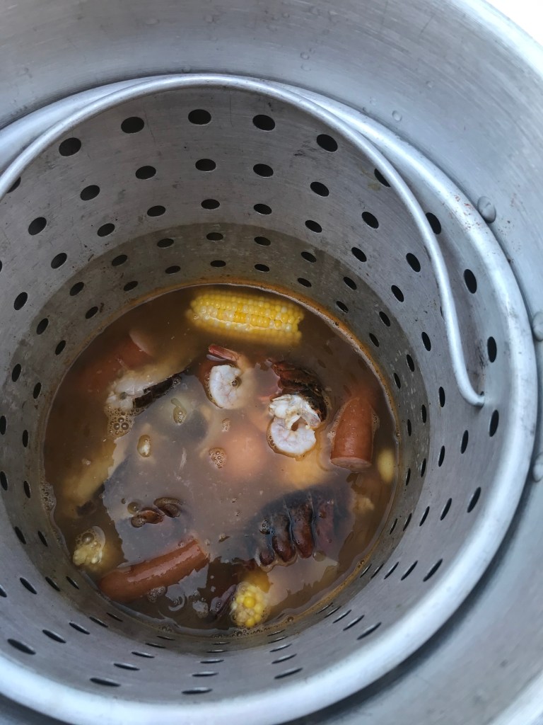 Corn and sausage are next. I give them about 5-10 minutes before I add the lobster tails and shrimp. Overcooked seafood will be very rubbery and not yummy so keep an eye on things here. The crab needs the least amount of time so those are last to go in the pot. When the tails turn red and the shrimp turn pink and start to curl they are done.