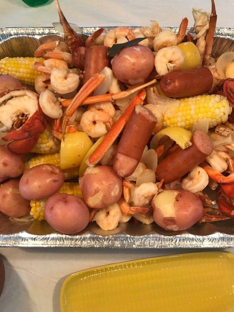 If you don’t have this type of pan set up, remove the seafood and veggies using tongs and a slotted soon. Careful – this stuff is hot!! I like to throw all this stuff in a large foil pan so that everyone can just dig into it. It makes things easier to clean up too.
