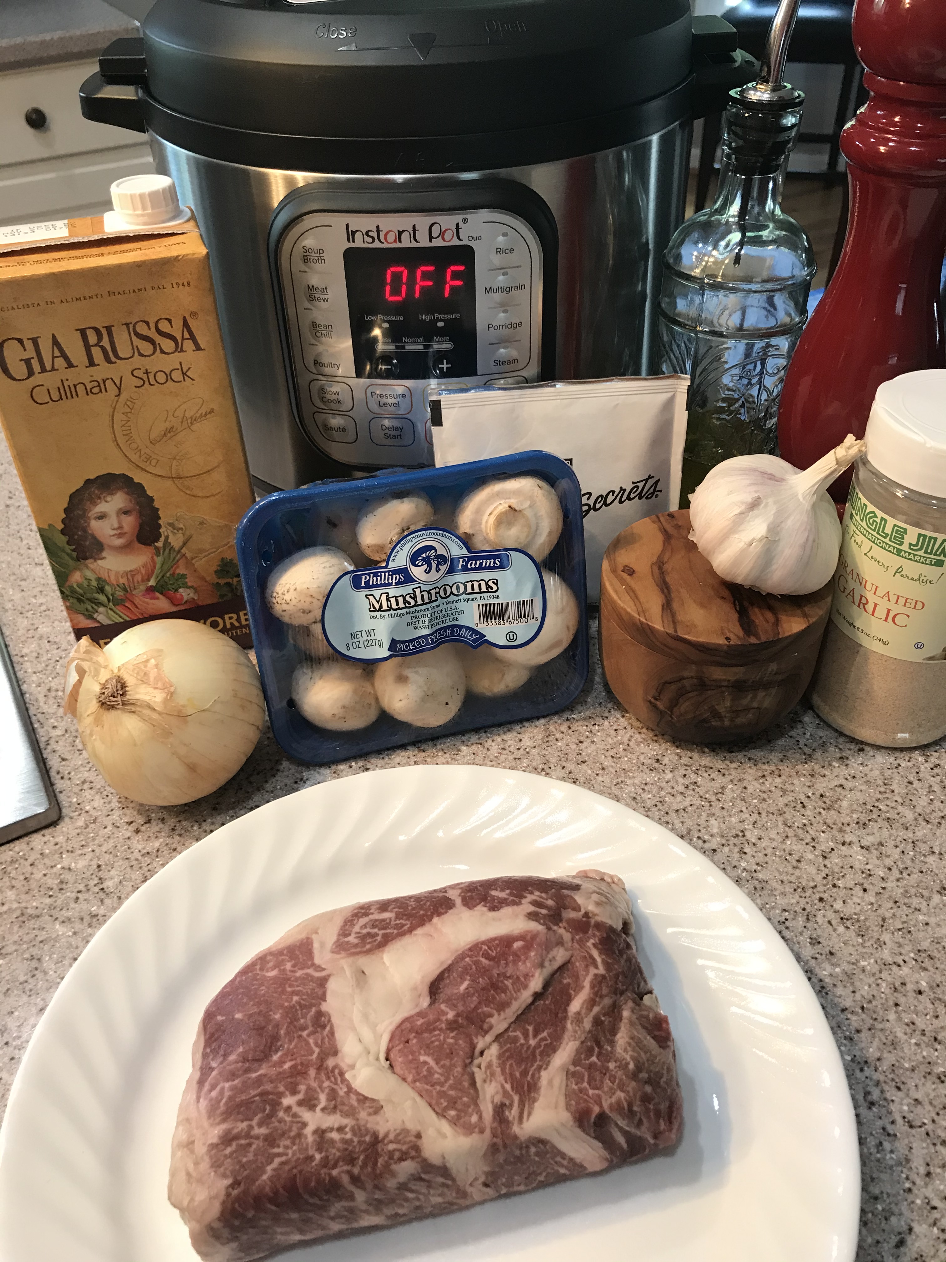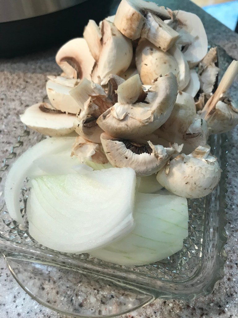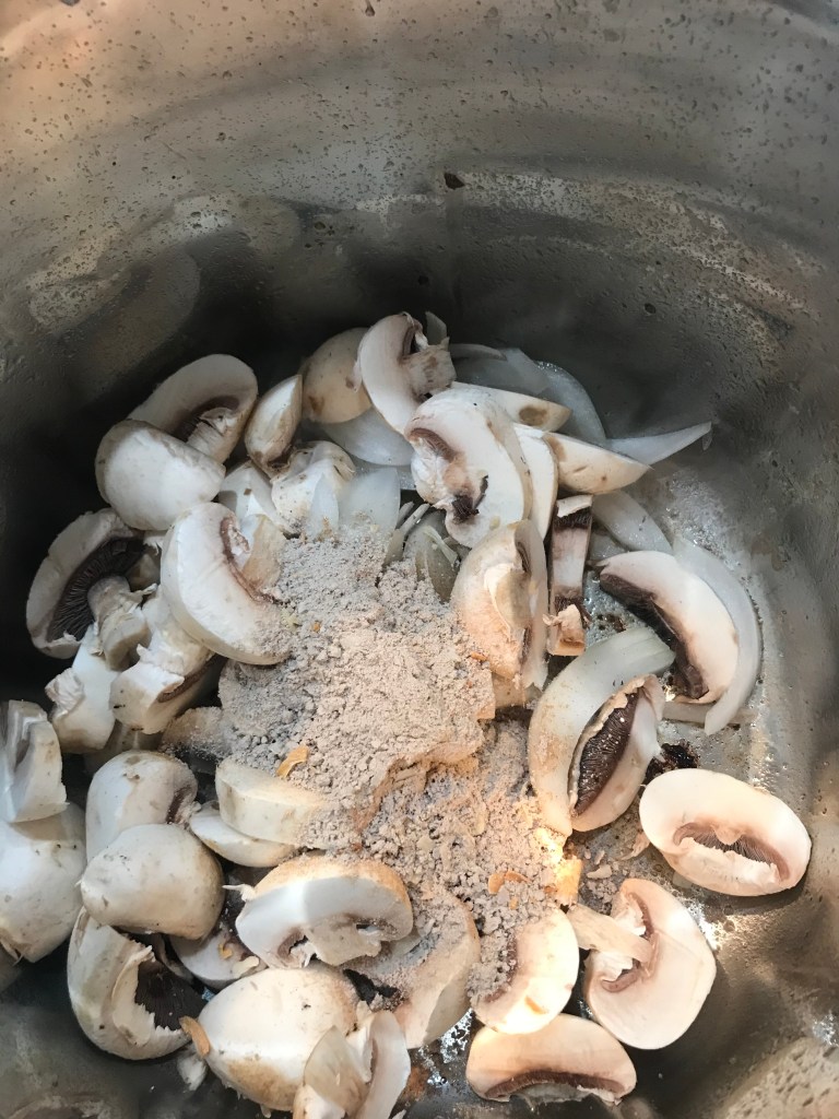 This recipe is a mash up of my mom’s recipe and a version that my great grandam made using canned cream of mushroom soup and canned gravy with a powdered soup mix and round steak. I like to use chuck roast for my pot roast and I like just some basic seasonings. For this test I threw in some mushrooms since I had them on hand and my husband likes them. Here’s all that I put in this one: