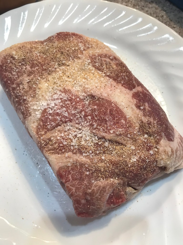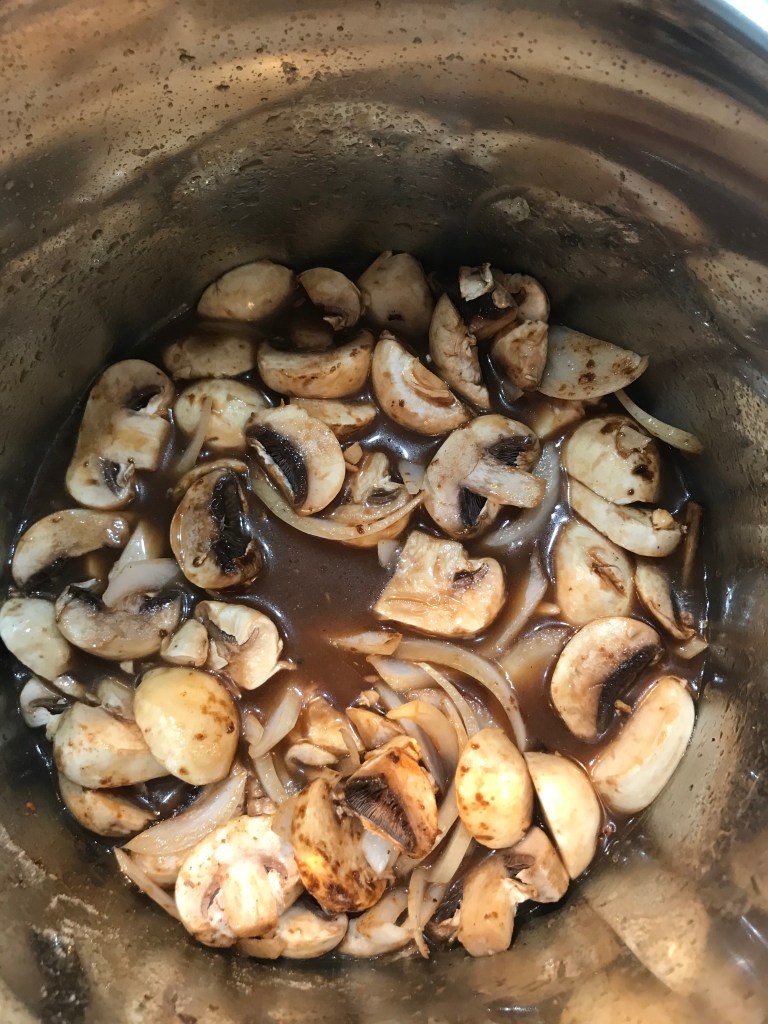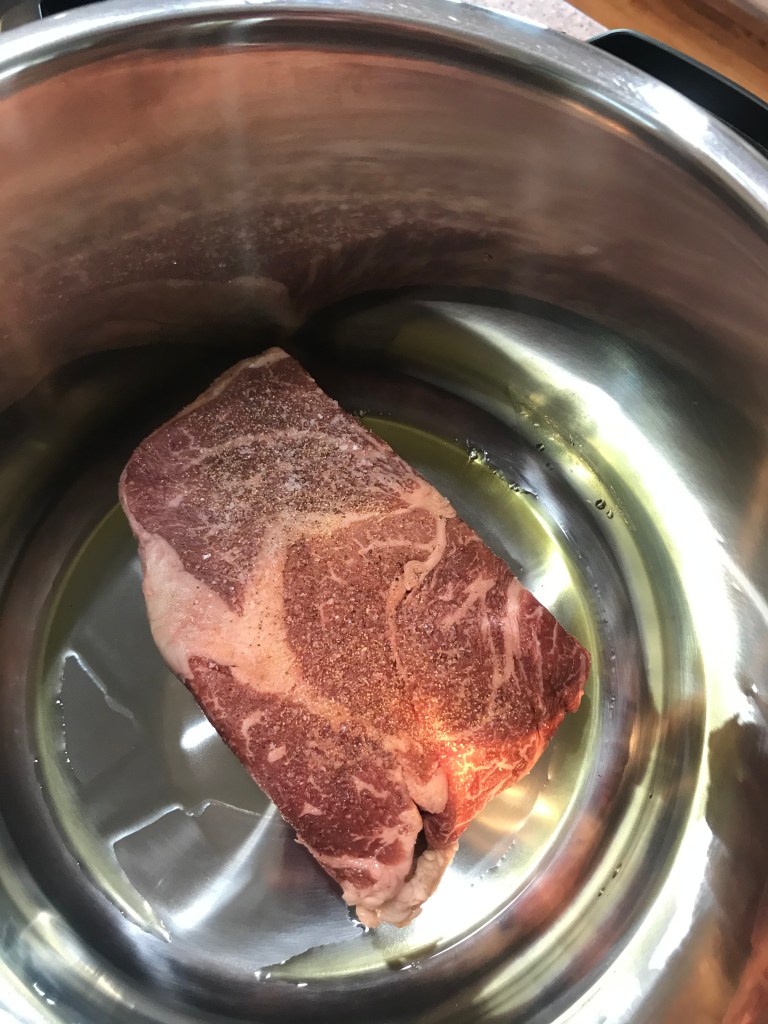 Next, I got my roast ready to go – coated bot sides with salt, pepper and some granulated garlic. I started the pot on the “saute” setting and added some olive oil, about 2 tbs. Once the oil was hot, I added the roast. I seared on both sides for about 5 minutes per side, and removed the meat from the pot.