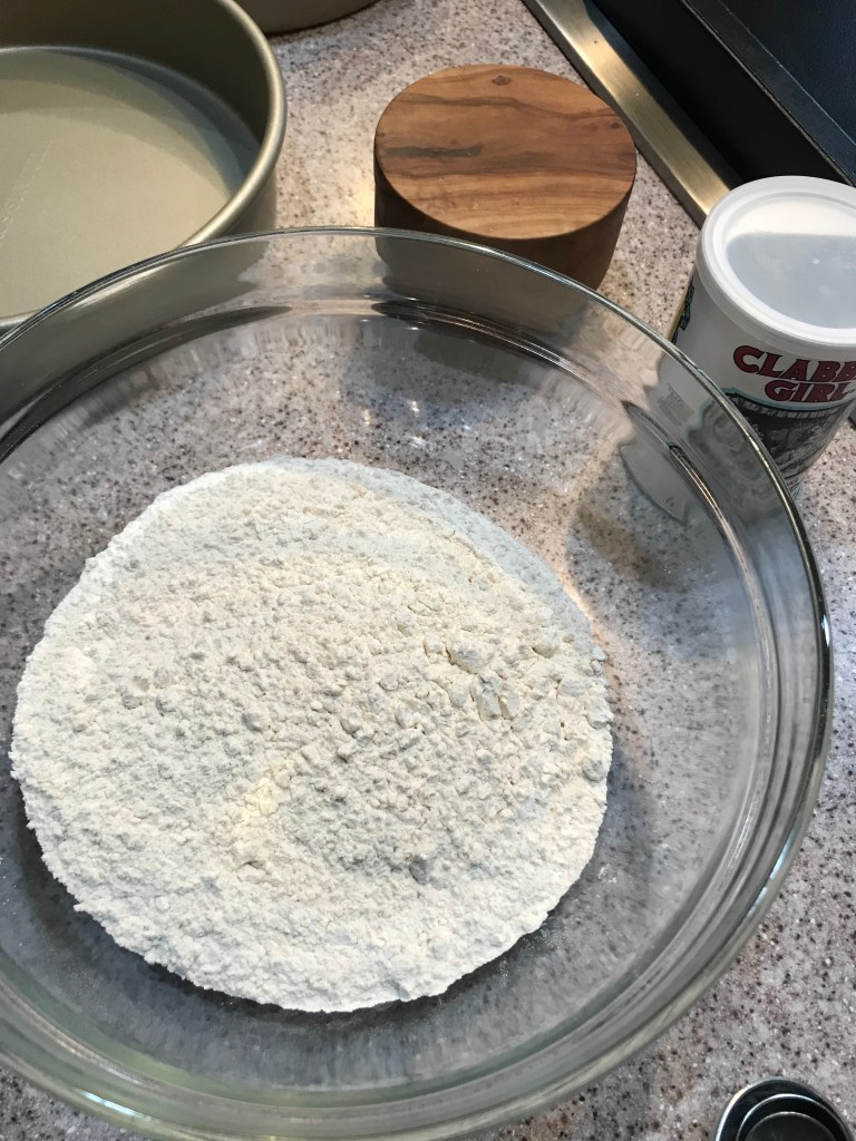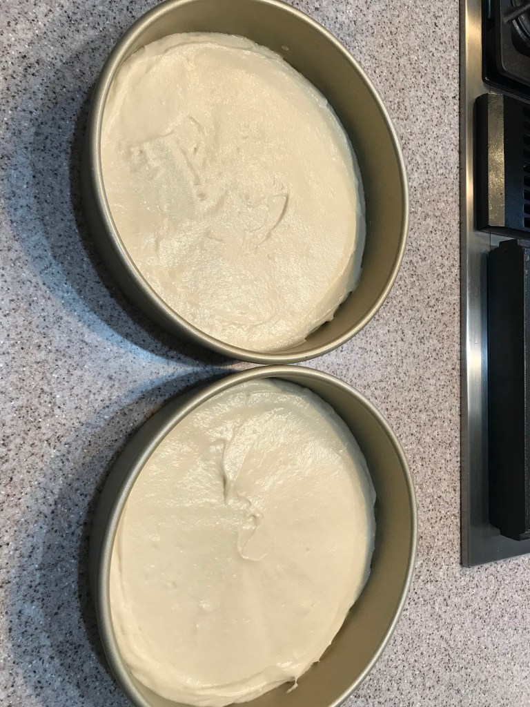 Preheat your oven to 350 degrees. Butter and flour (2) nine-inch cake pans. Set them aside while you prepare the cake.