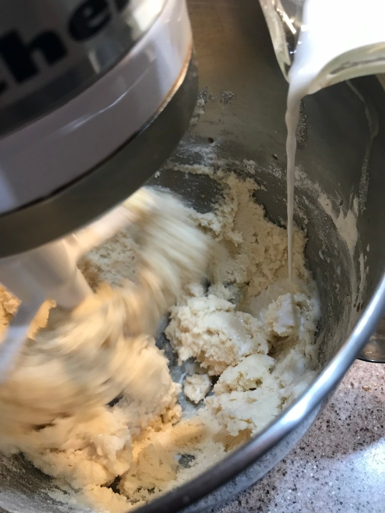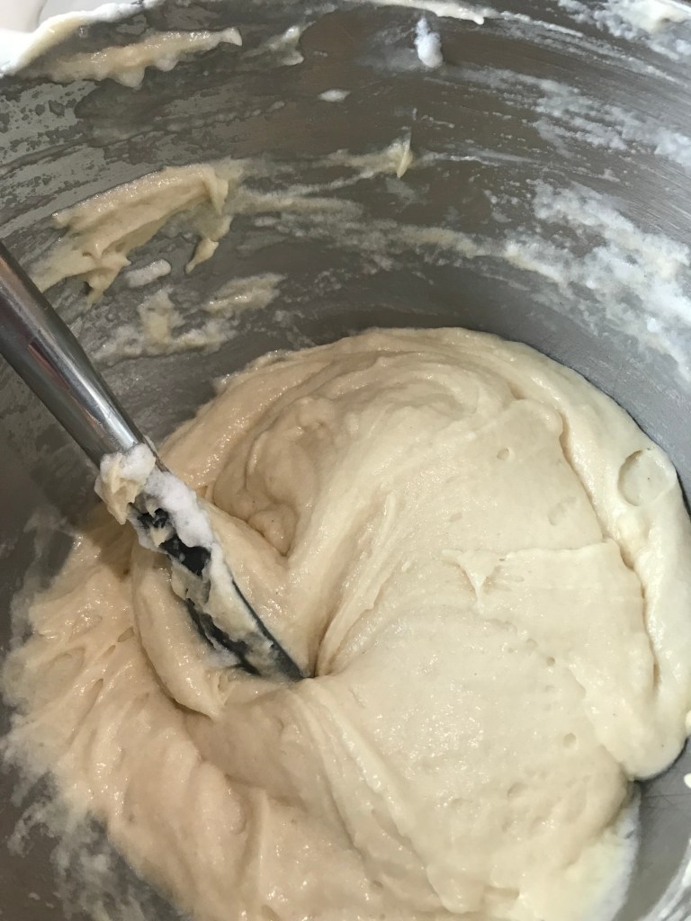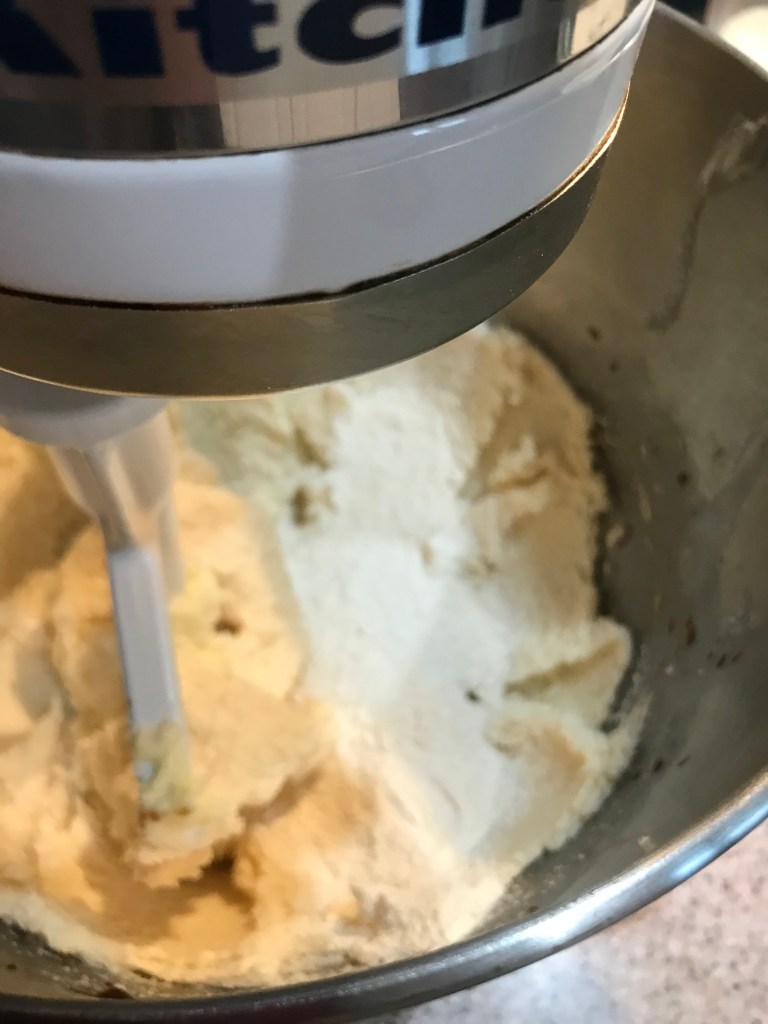 In the bowl of a stand mixer (or a large mixing bowl with a hand mixer) beat the butter for 3-4 minutes until light and creamy. Gradually add in the sugar and mix until well blended. Next, add the vanilla and the almond extracts. With the mixer on low speed, add 1/3 of the flour mixture. Let that fully mix in. Add 1/2 of the milk, while continuing to stir. Add another 1/3 of the flour, rest of the milk, rest of the flour, all while allowing the ingredients to blend before moving on to the next.
