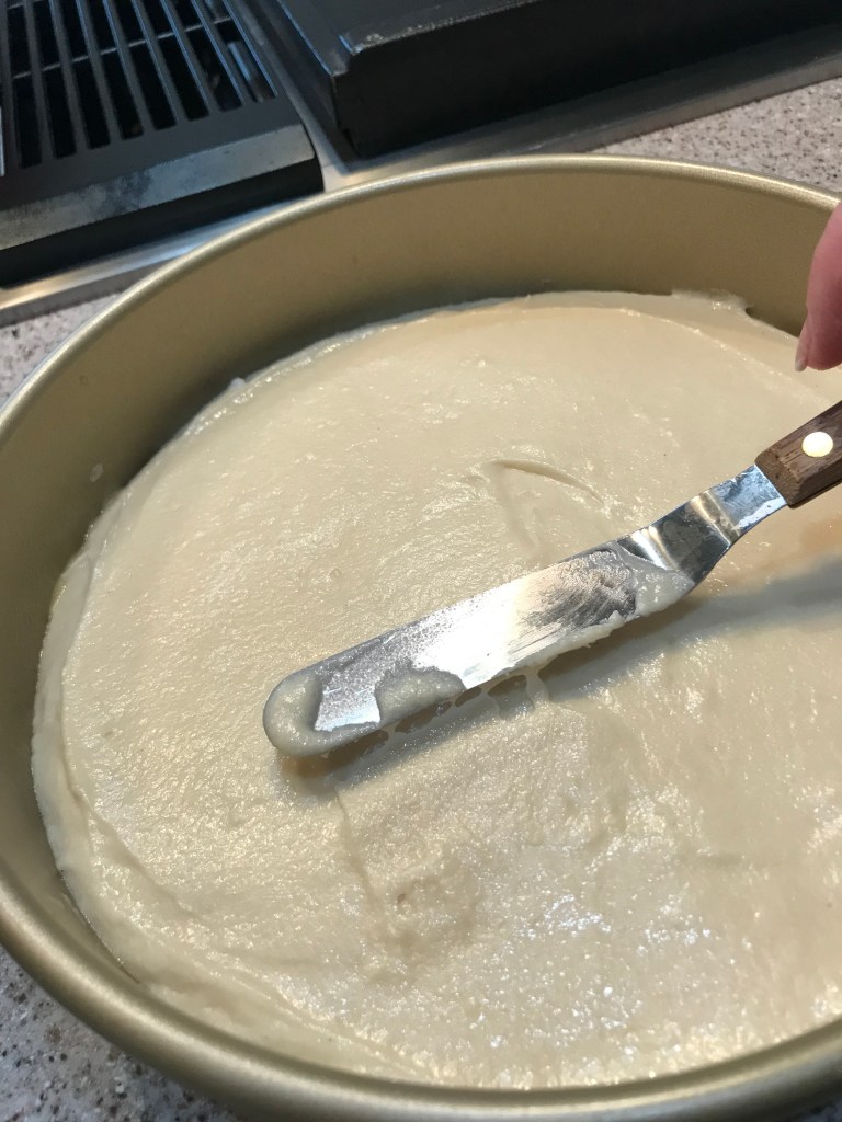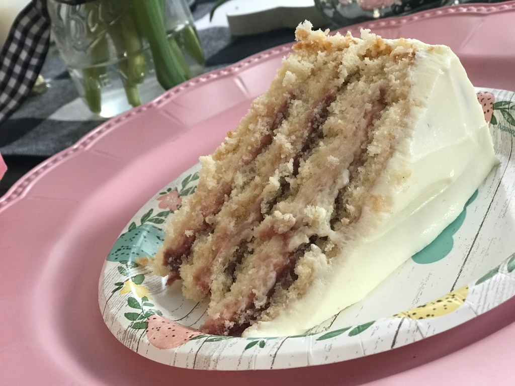 Either way, time to assemble. Place a small dab of icing on the serving platter to keep the bottom layer in place while you build the cake. Place the first layer cut side up and spread a layer of frosting, enough to cover it but not too thick. Drizzle the preserves over the frosting, being sure to stay at away from the edges so you don’t end up with preserves oozing out the sides into the final layer of frosting. Place the next layer cut side down on the first layer. (If you are just using 2 layers, place the frosting and preserves between the layers and frost the cake whole from there.)
