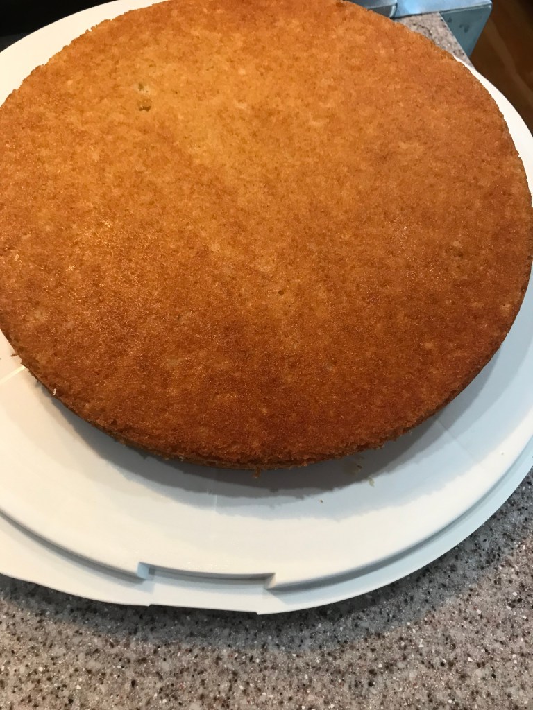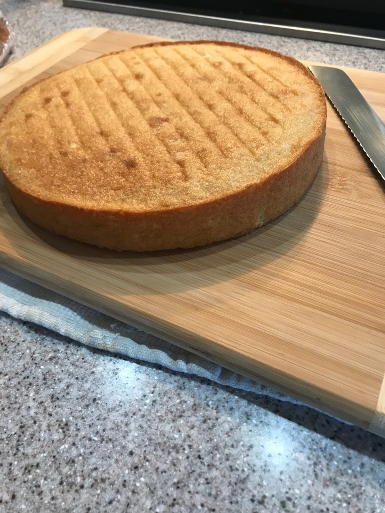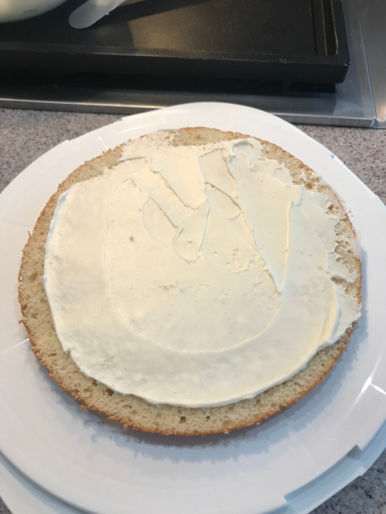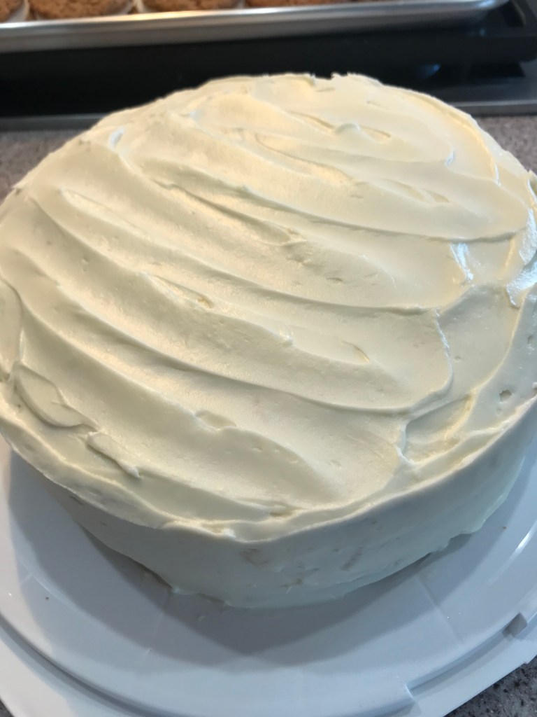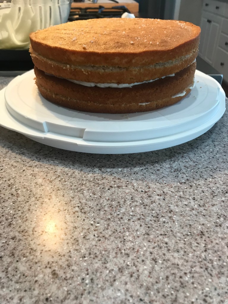Here’s the concentration part – cutting the cakes in half, so you have 4 layers. If you aren’t up for it, it is perfectly acceptable to make this a 2-layer cake and move on. I actually made this with a box cake mix (shocking I know) and tried to make the filling and frosting. That ended up being called a “slide cake” by my family and this cake has been (lovingly) referred to by that name ever since. I had put too much filling and icing in the middle and the heat in my kitchen caused a huge mess, resulting in a more trifle desert once I was done taking out my frustration on it. In my own defense, it was still tasty.