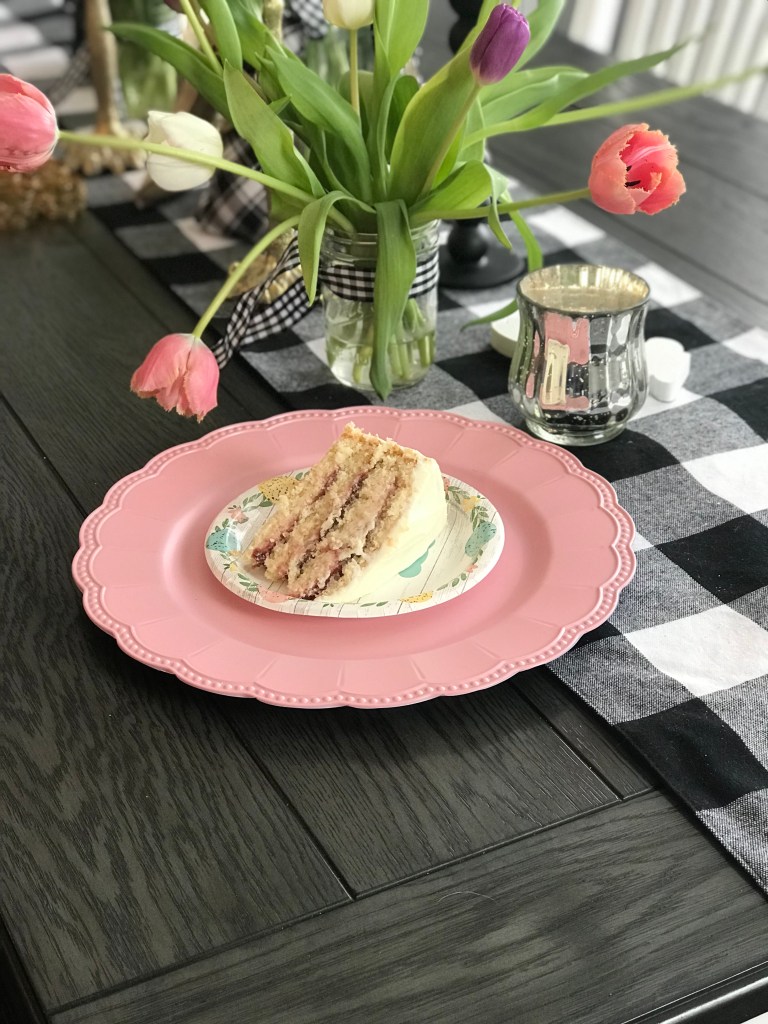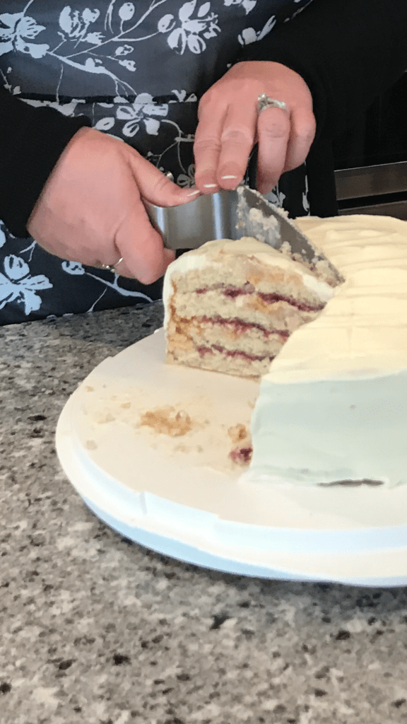Repeat with the next layer, if you have cut the layers in half. Once all the layers are assembled, frost the cake with the rest of the icing. I managed to get things pretty even, decorating is not my strong skill, but it looked pretty just the same. You can decorate with fresh raspberries around the top, or sliced almonds pressed on the sides if you feel fancy. Clearly, I wasn’t in fancy mode here.