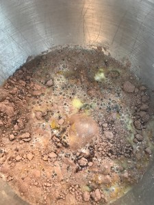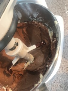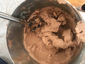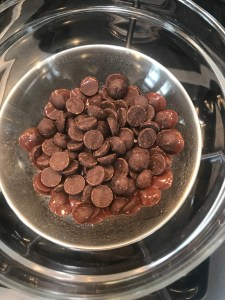 While you cake is taking a chill, make the frosting. Melt the chocolate – Two ways to do this: first, in the micorwave. Break up the pices of chocoate and microwave in a safe bowl, heat 20-30 seconds at a time until fully melted, sitring in between. I like to do this in a double boiler (because I tend to over do it in the microwave) – put the chocolate in a heat proof bowl and melt it over simmering water, makeing sure the bowl does not touch the water, sitring constantly until melted. Set melted chocolate aside to cool.