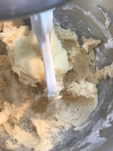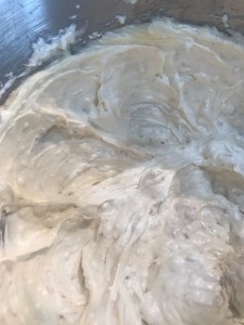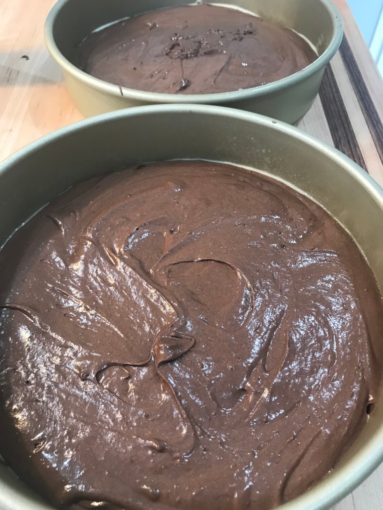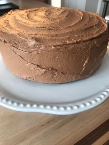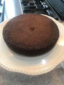 Starrt assembling the cake: Place one layer of the cake on a platter or cake stand that you can put into the fridge. Add the filing in an even layer, leaving a small boarder (1″ or so) and place the top layer on. Put in the firdge for 45 minutes or so to allow the filling to set so it doesn’t slide around when you put the icing on.