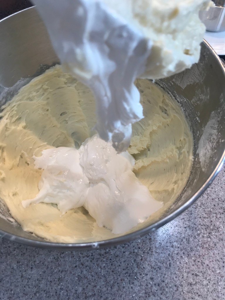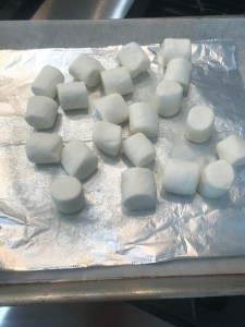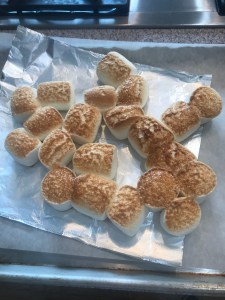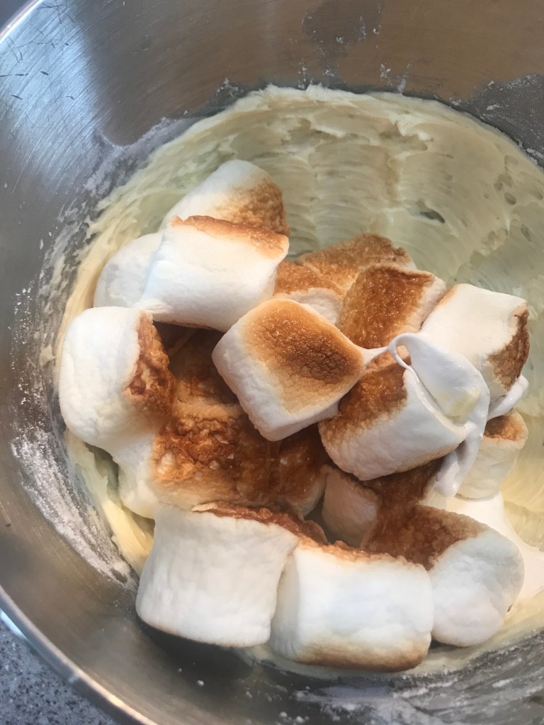 For the filling – You need to toast marshmallows and there are two ways I’ve tried this. I used to put them on foil sprayed with cooking spray and put them under the broiler. That works great, but you need to watch them like crazy. I did it this way a bunch of times when I started making this cake. You can also use a cooking tourch if you have one. One of my besties got me one as a gift and I love it. Either way, toast the top, let them sit for a bit then flip them over and do the other side. Next up, in a mixing bowl or a stand mixer beat the butter and sugar together on medium low speed until blended. Add the vanilla and beat about 3 minutes. Turn down the speed to about medium low and add the fluff and the toasted marshmallows to the bowl. Add the cream to thin it out enough to make it spreadable. Give the filling a final mix by hand to to make sure it’s well incorporated.